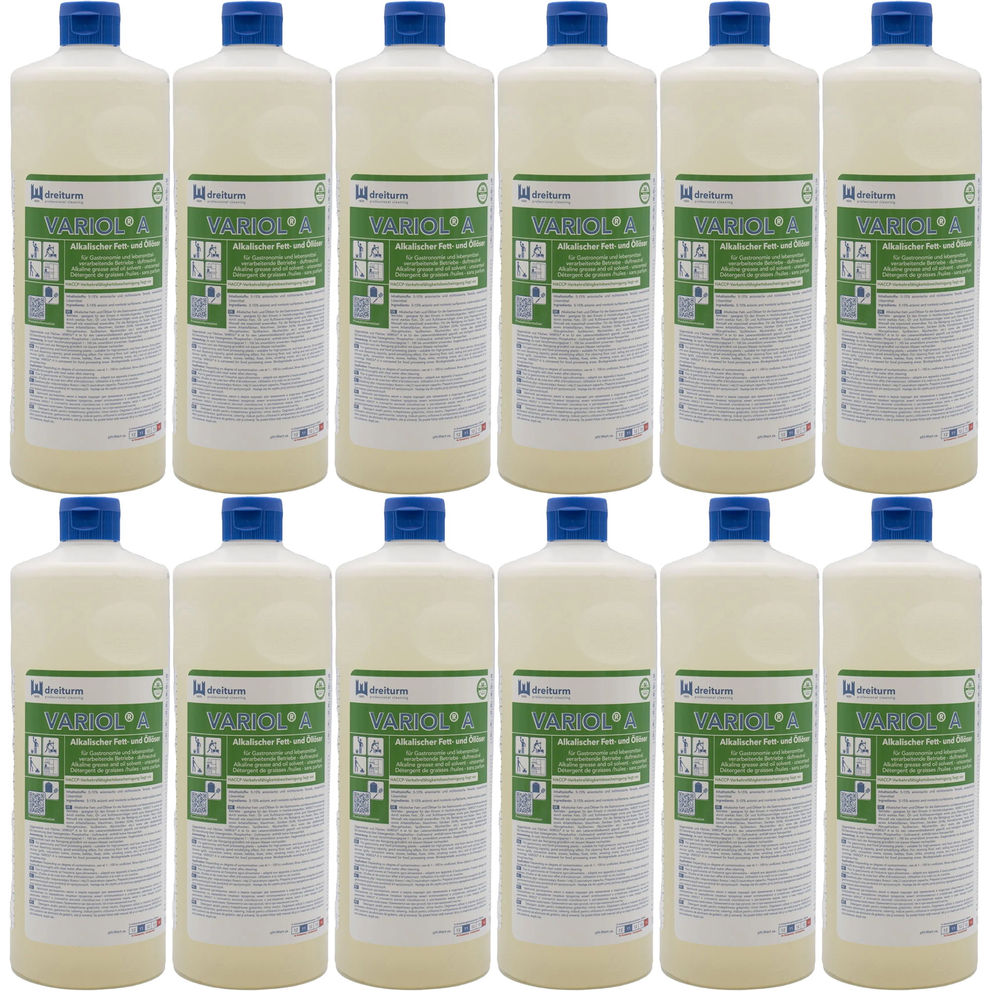 VARIOL A ist ein hochwirksamer alkalischer Fett- und Öllöser für den professionellen Einsatz in Gastronomie und lebensmittelverarbeitenden Betrieben. Er entfernt zuverlässig hartnäckige Verschmutzungen wie Fett, Öl und Russ und sorgt für hygienisch saubere Oberflächen in stark beanspruchten Bereichen. Dank seiner starken Reinigungsleistung und guten Emulgierwirkung eignet sich VARIOL A sowohl für die manuelle Reinigung als auch für den Einsatz mit Maschinen, Hochdruck- oder Schaumgeräten. Das Produkt ist vielseitig einsetzbar und ideal für Boden-, Wand- und Deckenflächen sowie für Maschinen und Küchengeräte wie Grills, Konvektomaten, Herde, Kessel oder Abzugshauben. Die Formulierung ist frei von Duftstoffen, NTA und Phosphaten und erfüllt die Anforderungen für den Einsatz im Lebensmittelbereich. Die HACCP-Verkehrsfähigkeitsbescheinigung bestätigt die Eignung für hygienisch sensible Bereiche. Zudem ist das Produkt biologisch abbaubar und enthält keine Nanopartikel.