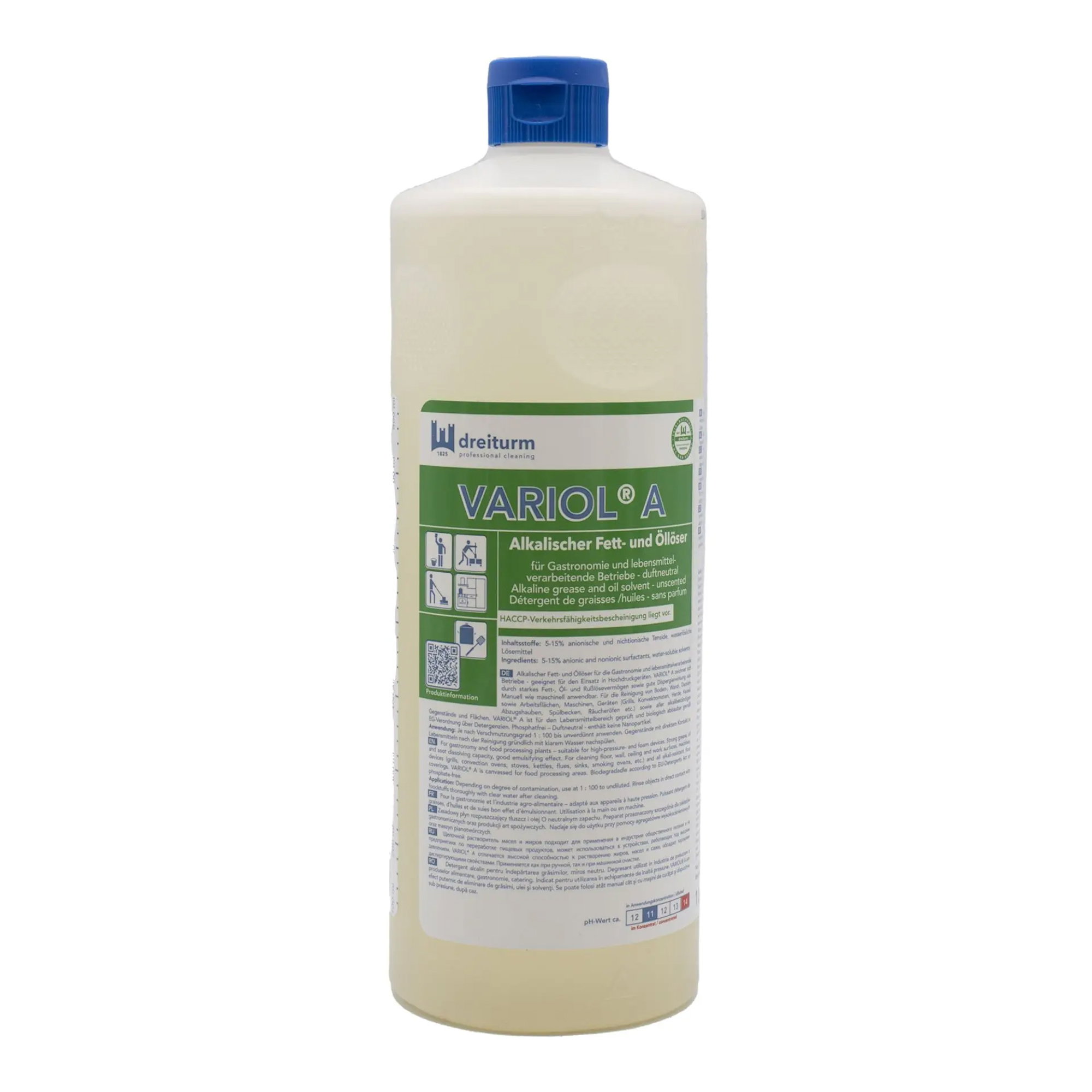 VARIOL A ist ein hochwirksamer alkalischer Fett- und Öllöser für den professionellen Einsatz in Gastronomie und lebensmittelverarbeitenden Betrieben. Er entfernt zuverlässig hartnäckige Verschmutzungen wie Fett, Öl und Russ und sorgt für hygienisch saubere Oberflächen in stark beanspruchten Bereichen. Dank seiner starken Reinigungsleistung und guten Emulgierwirkung eignet sich VARIOL A sowohl für die manuelle Reinigung als auch für den Einsatz mit Maschinen, Hochdruck- oder Schaumgeräten. Das Produkt ist vielseitig einsetzbar und ideal für Boden-, Wand- und Deckenflächen sowie für Maschinen und Küchengeräte wie Grills, Konvektomaten, Herde, Kessel oder Abzugshauben. Die Formulierung ist frei von Duftstoffen, NTA und Phosphaten und erfüllt die Anforderungen für den Einsatz im Lebensmittelbereich. Die HACCP-Verkehrsfähigkeitsbescheinigung bestätigt die Eignung für hygienisch sensible Bereiche. Zudem ist das Produkt biologisch abbaubar und enthält keine Nanopartikel.