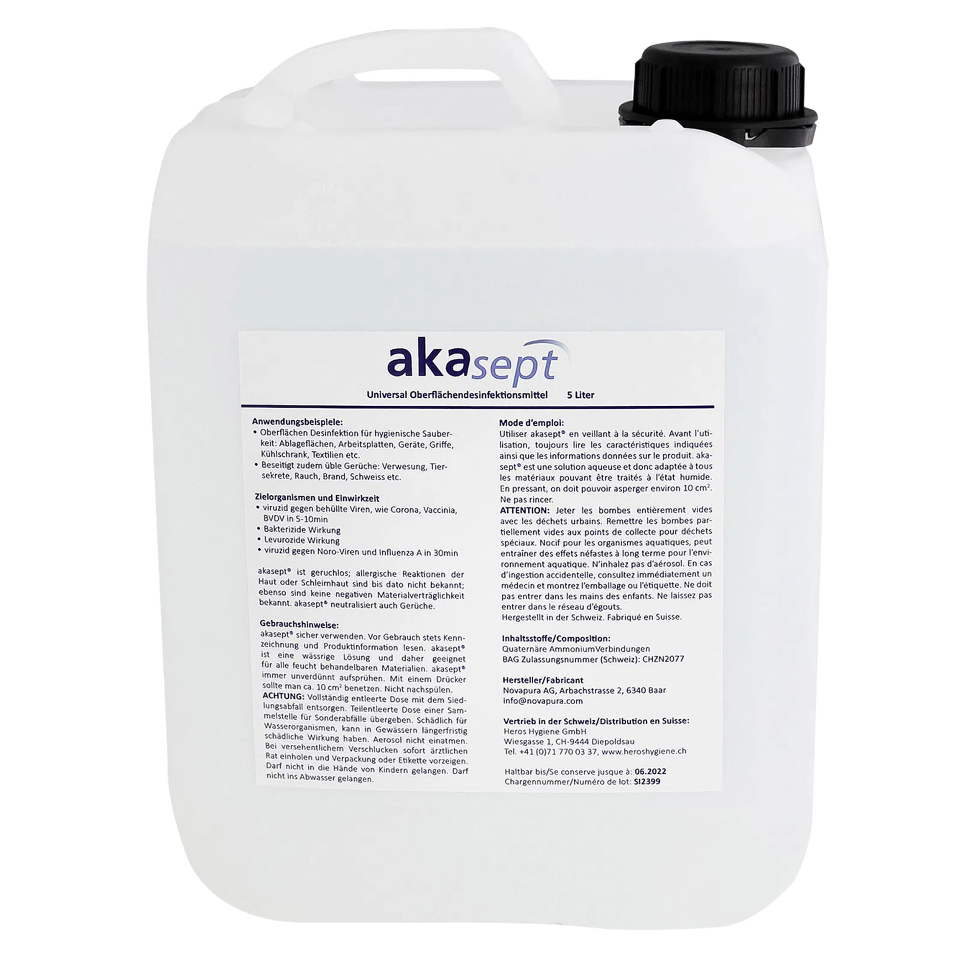 akasept® ist ein vielseitiges Desinfektionsmittel für Oberflächen. Es eliminiert effektiv Viren (einschließlich Covid-19), Bakterien, Pilze und Sporen. akasept® ist geruchlos und entfernt zuverlässig unangenehme Gerüche wie Nikotinrauch, Schweiß, Tiersekrete oder Verwesung. Akasept ist äußerst effektiv und sorgt für hygienische Sauberkeit. Der große Vorteil des Inhaltsstoffs (quartäre Ammoniumverbindung, QAV) besteht darin, dass er eine langanhaltende Wirkung hat und nicht sofort verdunstet. Die Produktion erfolgt in der Schweiz. akasept® ist nicht brennbar, was gegenüber alkoholhaltigen Desinfektionsmitteln einen wesentlichen Vorteil darstellt.