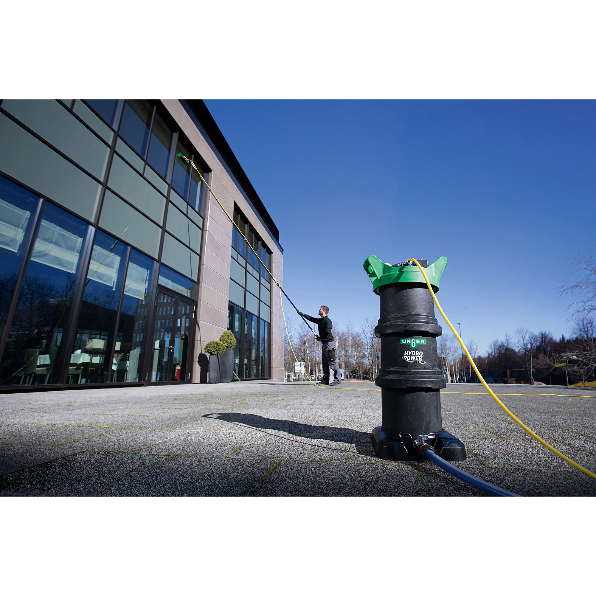 Das UNGER Reinigungssystem HydroPower Ultra Filter L arbeitet nach dem Prinzip der Deionisierung. Dabei wird Leitungswasser in den Filtertank geleitet und durch Ionen-Austausch-Harz geführt. Das Ergebnis ist vollständig entmineralisiertes Reinwasser, das ohne chemische Zusätze für eine streifenfreie Reinigung verwendet werden kann.